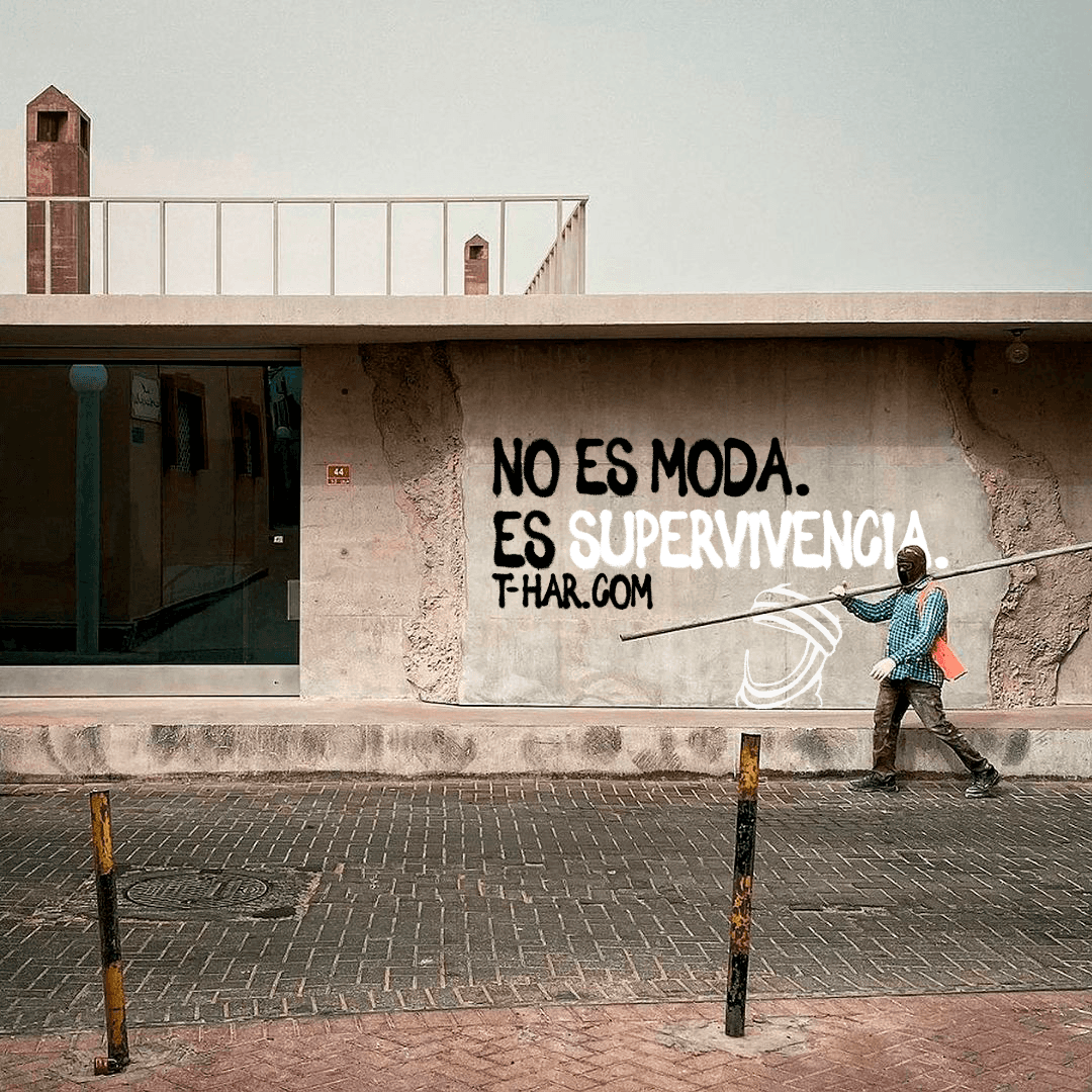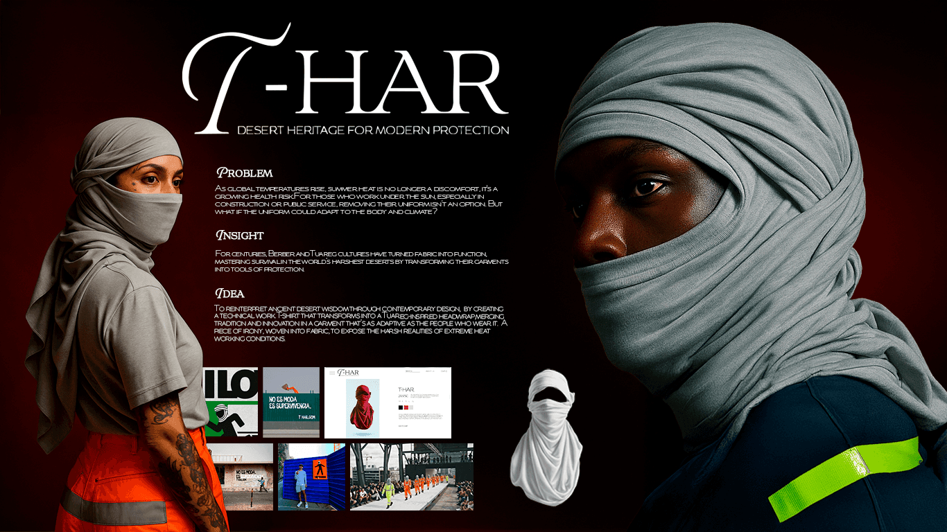 EXTREME HEAT IS BECOMING A THREAT FOR OUTDOOR WORKERS WHO CAN’T REMOVE THEIR UNIFORMS. INSPIRED BY BERBER AND TUAREG DESERT WEAR, THIS PROJECT MERGES TRADITION AND FUNCTIONALITY. A WORK T-SHIRT THAT TRANSFORMS INTO A PROTECTIVE HEADWRAP. A WEARABLE IRONY AGAINST RISING TEMPERATURES TO DRIVE CHANGE FOR BETTER WORKING CONDITIONS.